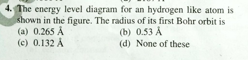 The energy level diagram for an hydrogen like atom is shown in the figure. The radius of its first Bohr orbit is The energy level diagram for an hydrogen like atom is shown in the figure. The radius of its first Bohr orbit is September 14, 2020 Category: Uncategorised (JEE Advanced Physics by BM Sharma + GMP Solutions) , Facebook Messenger WhatsApp Share this:TwitterFacebook Related