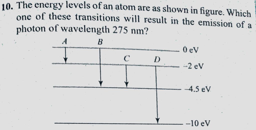 The energy levels of an atom are as shown in figure. Which one of these transitions will result in the emission of a photon of wavelength 275 nm ? The energy levels of an atom are as shown in figure. Which one of these transitions will result in the emission of a photon of wavelength 275 nm ? October 15, 2020 Category: Uncategorised (JEE Advanced Physics by BM Sharma + GMP Solutions) , Facebook Messenger WhatsApp Share this:TwitterFacebook Related