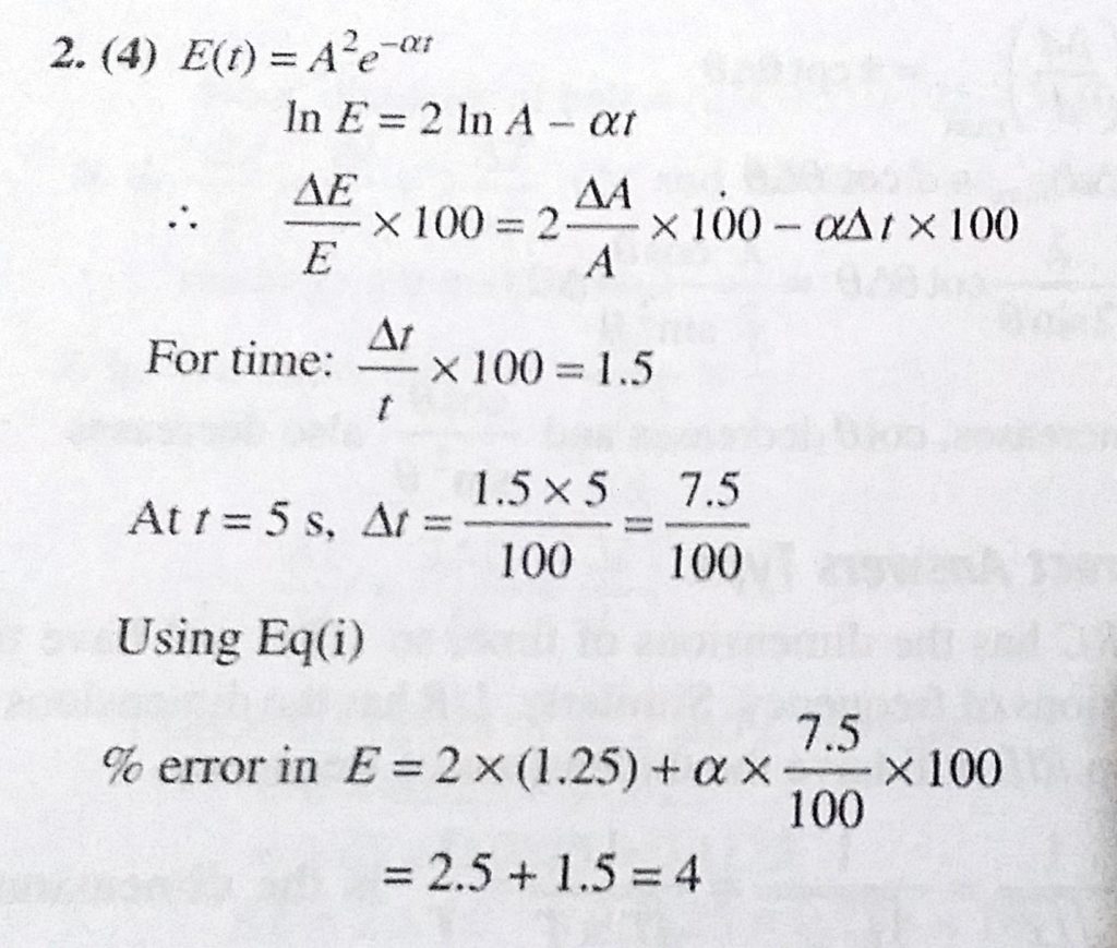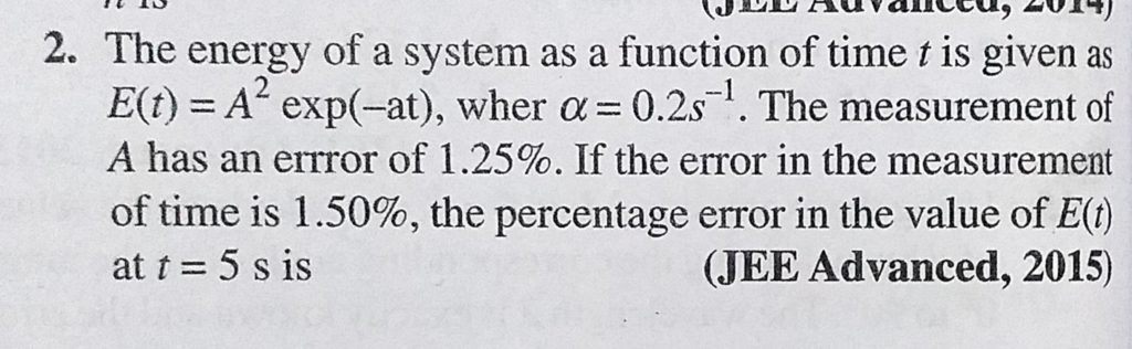The energy of a system as a function of time t is given as E (t) = A^2 exp (-at), where alpha = 0.2 s^-1. The measurement of A has an error of 1.25%. If the error in the measurement of time is The energy of a system as a function of time t is given as E (t) = A^2 exp (-at) where alpha = 0.2 s^-1. The measurement of A has an error of 1.25%. If the error in the measurement of time is September 16, 2020 Category: Uncategorised (JEE Advanced Physics by BM Sharma + GMP Solutions) , Facebook Messenger WhatsApp Share this:TwitterFacebook Related
