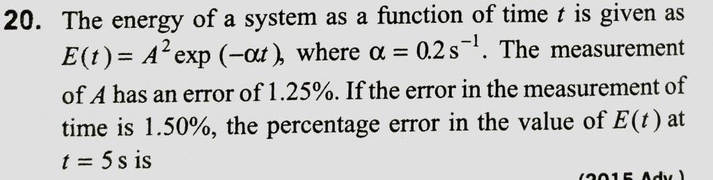 The energy of a system as a function of time t is given as E(t)=A^2 exp(−αt), α=0.2 s−1. The measurement of A has an error of 1.25%. If the error In the measurement of time is 1.50%, the percentage error in the value of E(t) at t = 5 s` is The energy of a system as a function of time t is given as E(t)=A^2 exp(−αt) the percentage error in the value of E(t) at t = 5 s` is α=0.2 s−1. The measurement of A has an error of 1.25%. If the error In the measurement of time is 1.50% February 12, 2021 Category: Uncategorised (JEE Advanced Physics by BM Sharma + GMP Solutions) , Facebook Messenger WhatsApp Share this:TwitterFacebook Related