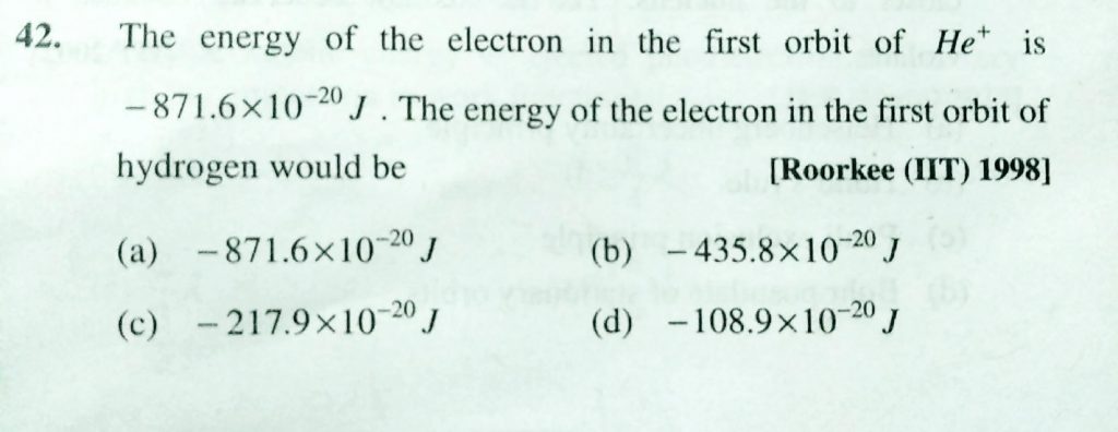 The energy of the electronn in the first orbit of He^+ is -871.6 x 10^-20 J. The energy of the electron in the first orbit of hydrogen would be The energy of the electronn in the first orbit of He^+ is -871.6 x 10^-20 J. The energy of the electron in the first orbit of hydrogen would be November 30, 2020 Category: Uncategorised (JEE Advanced Physics by BM Sharma + GMP Solutions) , Facebook Messenger WhatsApp Share this:TwitterFacebook Related