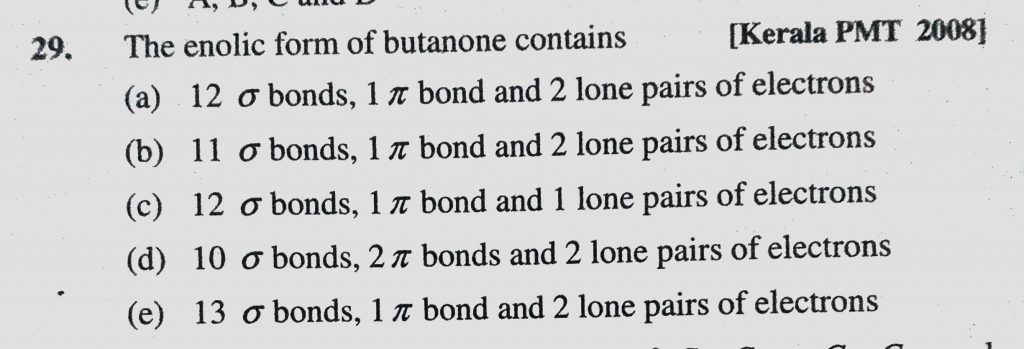 The enolic form of butanone contains (a) 12 sigma bonds, 1 pie bond and 2 lone pair of electrons (b) 11 sigma bonds, 1 pie bond and 2 lone pairs of electrons 1 pie bond and 2 lone pair of electrons (b) 11 sigma bonds 1 pie bond and 2 lone pairs of electrons The enolic form of butanone contains (a) 12 sigma bonds December 8, 2020 Category: Uncategorised (JEE Advanced Physics by BM Sharma + GMP Solutions) , Facebook Messenger WhatsApp Share this:TwitterFacebook Related