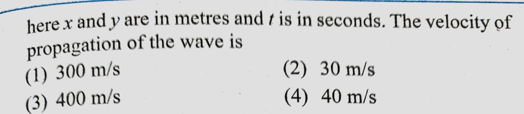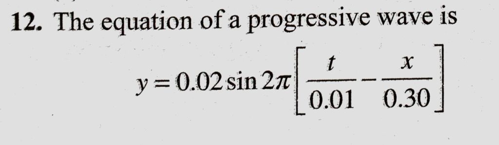 The equation of a progressive wave is y = 0.02 sin 2 pie ( t / 0.01 – x / 0.30) here x and y are in metres and t is in seconds. The velocity of propagation of the wave is The equation of a progressive wave is y = 0.02 sin 2 pie ( t / 0.01 - x / 0.30) here x and y are in metres and t is in seconds. The velocity of propagation of the wave is November 1, 2020 Category: Uncategorised (JEE Advanced Physics by BM Sharma + GMP Solutions) , Facebook Messenger WhatsApp Share this:TwitterFacebook Related