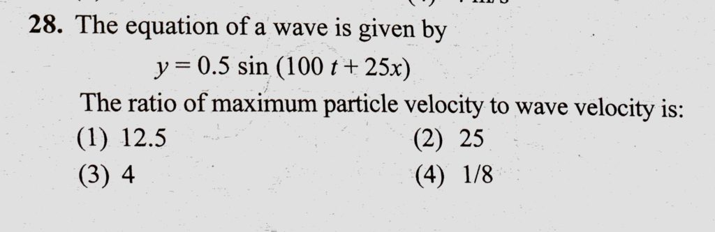 The equation of a wave is given by y = 0.5 sin (100 t + 25 x) The ratio of maximum particle velocity to wave velocity is : The equation of a wave is given by y = 0.5 sin (100 t + 25 x) The ratio of maximum particle velocity to wave velocity is : November 1, 2020 Category: Uncategorised (JEE Advanced Physics by BM Sharma + GMP Solutions) , Facebook Messenger WhatsApp Share this:TwitterFacebook Related