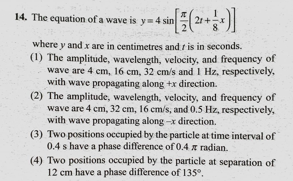 The equation of a wave is y = 4 sin (pie/2 (2t + 1/8x)) where y and x are in centimetres and t is in seconds. The equation of a wave is y = 4 sin (pie/2 (2t + 1/8x)) where y and x are in centimetres and t is in seconds. November 5, 2020 Category: Uncategorised (JEE Advanced Physics by BM Sharma + GMP Solutions) , Facebook Messenger WhatsApp Share this:TwitterFacebook Related