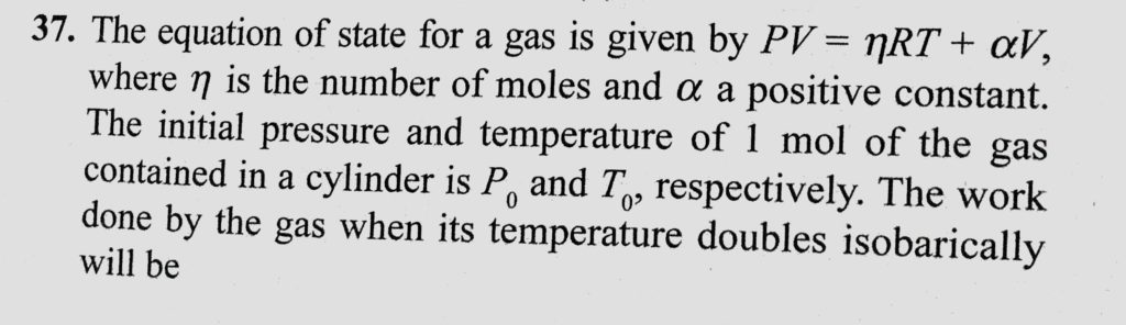 The equation of state for a gas is given by PV = nRT + alpha V, where n is the number of moles and alpha a positive constant. The initial pressure and temperature of 1 mol of the gas The equation of state for a gas is given by PV = nRT + alpha V where n is the number of moles and alpha a positive constant. The initial pressure and temperature of 1 mol of the gas October 29, 2020 Category: Uncategorised (JEE Advanced Physics by BM Sharma + GMP Solutions) , Facebook Messenger WhatsApp Share this:TwitterFacebook Related