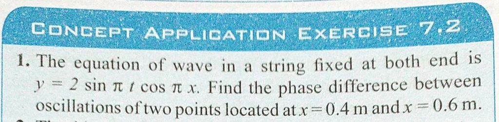 The equation of wave in a string fixed at both end is y = 2 sin pie t cos pie x. Find the phase difference between oscillations of two points located at x = 0.4 m and x = 0.6 m. The equation of wave in a string fixed at both end is y = 2 sin pie t cos pie x. Find the phase difference between oscillations of two points located at x = 0.4 m and x = 0.6 m. November 5, 2020 Category: Uncategorised (JEE Advanced Physics by BM Sharma + GMP Solutions) , Facebook Messenger WhatsApp Share this:TwitterFacebook Related
