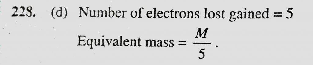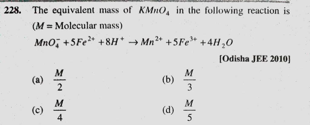 The equivalent mass of KMnO4 in the following reaction is (M = Molecular mass) (a) M/2 (b) M/3 (c) M/4 The equivalent mass of KMnO4 in the following reaction is (M = Molecular mass) (a) M/2 (b) M/3 (c) M/4 December 2, 2020 Category: Uncategorised (JEE Advanced Physics by BM Sharma + GMP Solutions) , Facebook Messenger WhatsApp Share this:TwitterFacebook Related