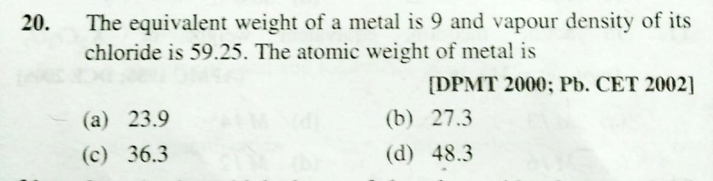 The equivalent weight of a metal is 9 and vapour density of its chloride is 59.25. The atomic weight of metal is The equivalent weight of a metal is 9 and vapour density of its chloride is 59.25. The atomic weight of metal is November 22, 2020 Category: Uncategorised (JEE Advanced Physics by BM Sharma + GMP Solutions) , Facebook Messenger WhatsApp Share this:TwitterFacebook Related