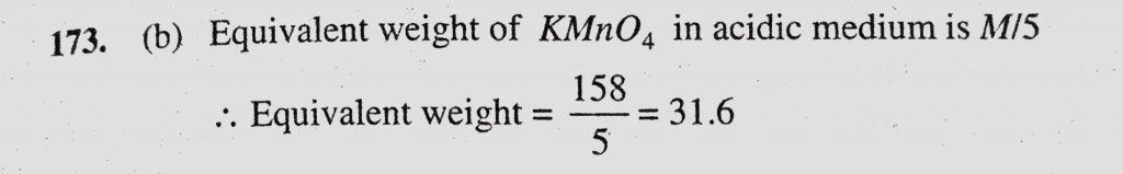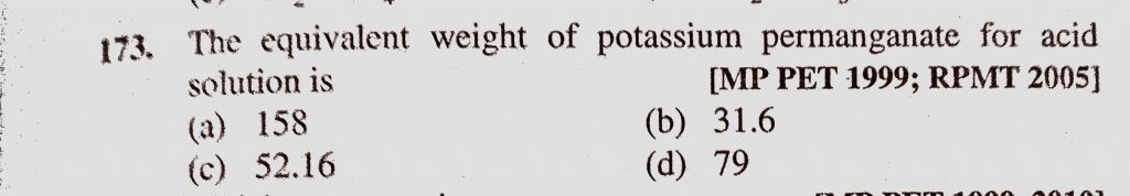The equivalent weight of potassium permaganate for acid solution is (a) 158 (b) 31.6 (c) 52.16 (d) 79 The equivalent weight of potassium permaganate for acid solution is (a) 158 (b) 31.6 (c) 52.16 (d) 79 December 2, 2020 Category: Uncategorised (JEE Advanced Physics by BM Sharma + GMP Solutions) , Facebook Messenger WhatsApp Share this:TwitterFacebook Related