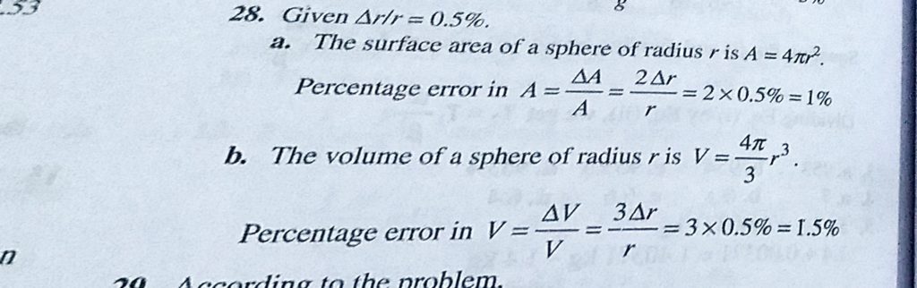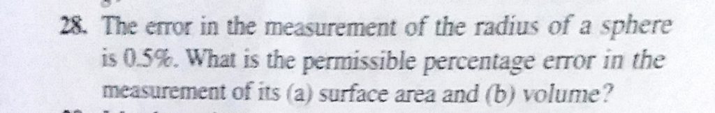 The error in the measurement of the radius of a sphere is 0.5%. What is the permissible percentage error in the measurement of its (a) surface area and (b) volume? The error in the measurement of the radius of a sphere is 0.5%. What is the permissible percentage error in the measurement of its (a) surface area and (b) volume? September 14, 2020 Category: Uncategorised (JEE Advanced Physics by BM Sharma + GMP Solutions) , Facebook Messenger WhatsApp Share this:TwitterFacebook Related