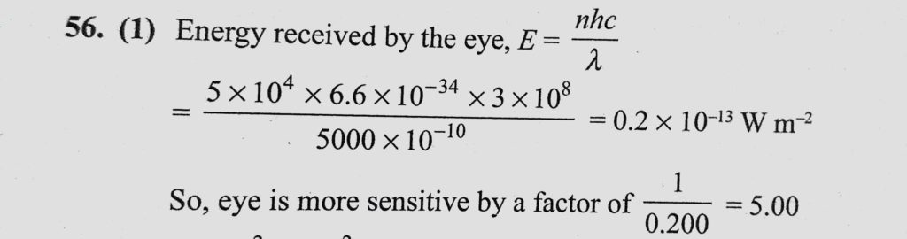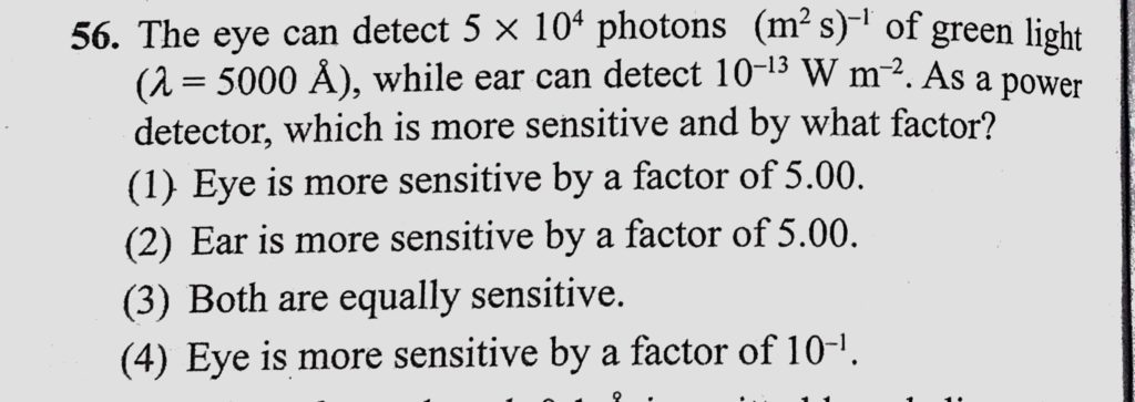 The eye can detect 5 * 10^4 photons ( m^2 s)^-1 of green light (lemda = 5000 A), while ear can detect 10^-13 W/m^2. As a power detector, which is more sensitive and by what factor? The eye can detect 5 * 10^4 photons ( m^2 s)^-1 of green light (lemda = 5000 A) which is more sensitive and by what factor? while ear can detect 10^-13 W/m^2. As a power detector October 14, 2020 Category: Uncategorised (JEE Advanced Physics by BM Sharma + GMP Solutions) , Facebook Messenger WhatsApp Share this:TwitterFacebook Related