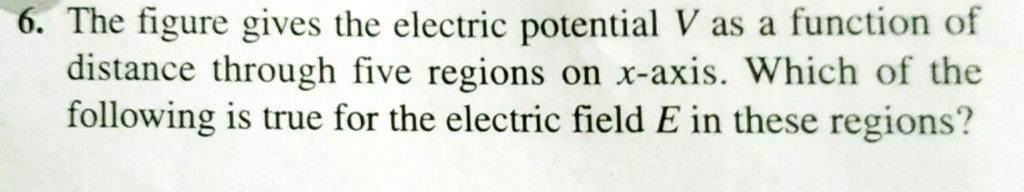The figure gives the electric potential V as a function of distance through five redgions on x axis. which of the following is true for the electric field E in these regions ? The figure gives the electric potential V as a function of distance through five redgions on x axis. which of the following is true for the electric field E in these regions ? September 17, 2020 Category: Uncategorised (JEE Advanced Physics by BM Sharma + GMP Solutions) , Facebook Messenger WhatsApp Share this:TwitterFacebook Related