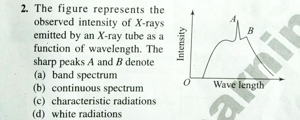 The figure represents the observed intensity by an X -ray tube as function of wavelength. The sharp peaks A and B denote The figure represents the observed intensity by an X -ray tube as function of wavelength. The sharp peaks A and B denote September 14, 2020 Category: Uncategorised (JEE Advanced Physics by BM Sharma + GMP Solutions) , Facebook Messenger WhatsApp Share this:TwitterFacebook Related