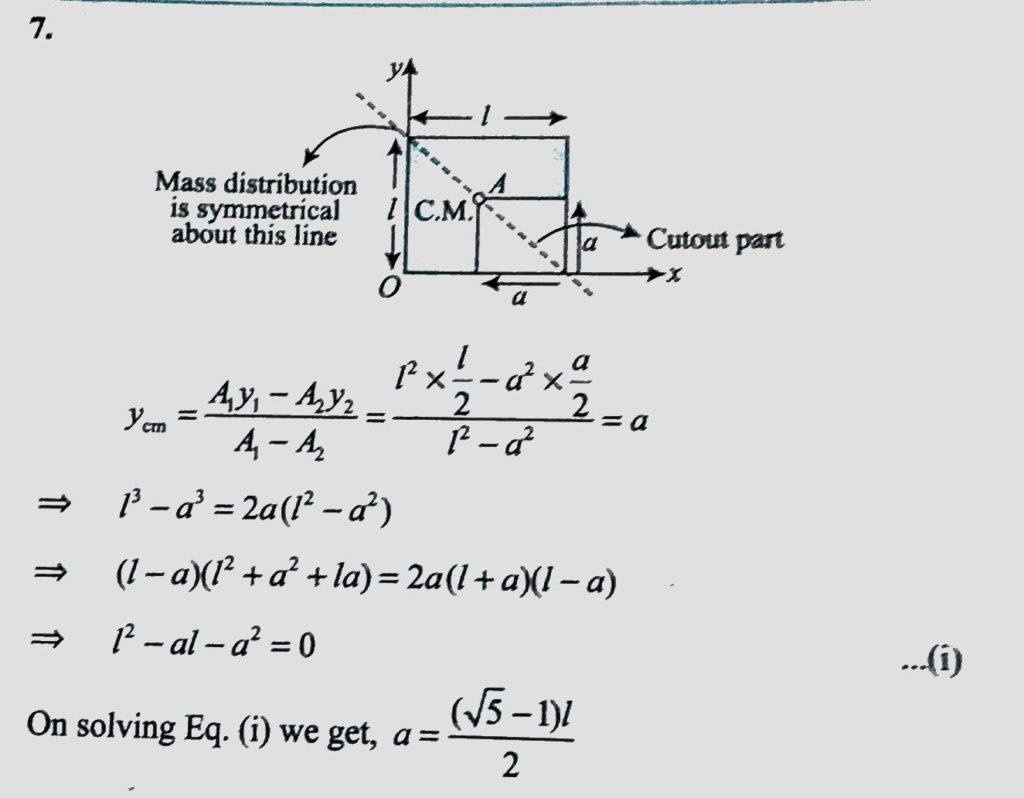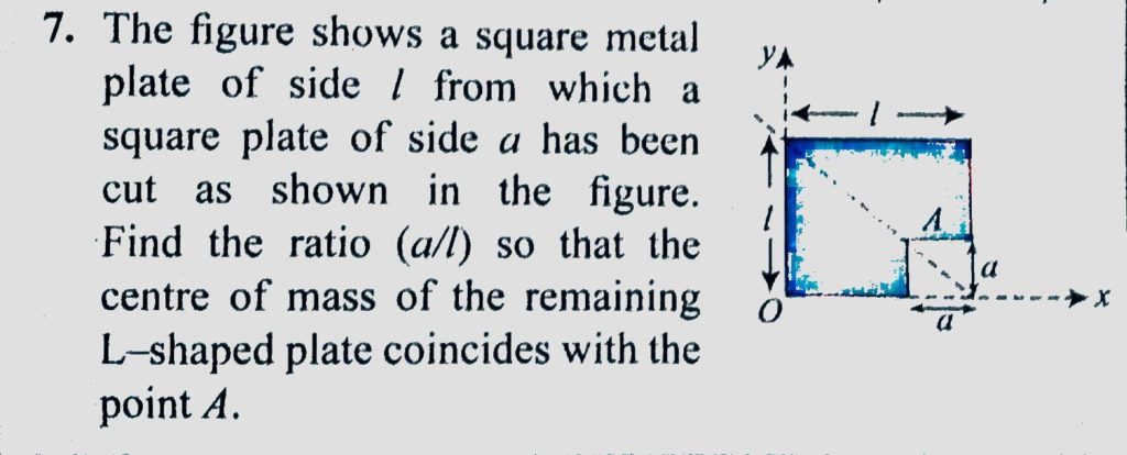 The figure shows a square metal plate of side l from which a square plate of side a has been cut as shown in the figure. Find the ratio ( a/ l ) so that centre of mass of the remaining L- shaped plate coincides with the point A. Determine the coordinate of centre of mass of a thin homogeneous plate having the form of a rectangle with sides r and 2r from which a semicircle with a radius r is cut out. September 20, 2020 Category: Uncategorised (JEE Advanced Physics by BM Sharma + GMP Solutions) , Facebook Messenger WhatsApp Share this:TwitterFacebook Related