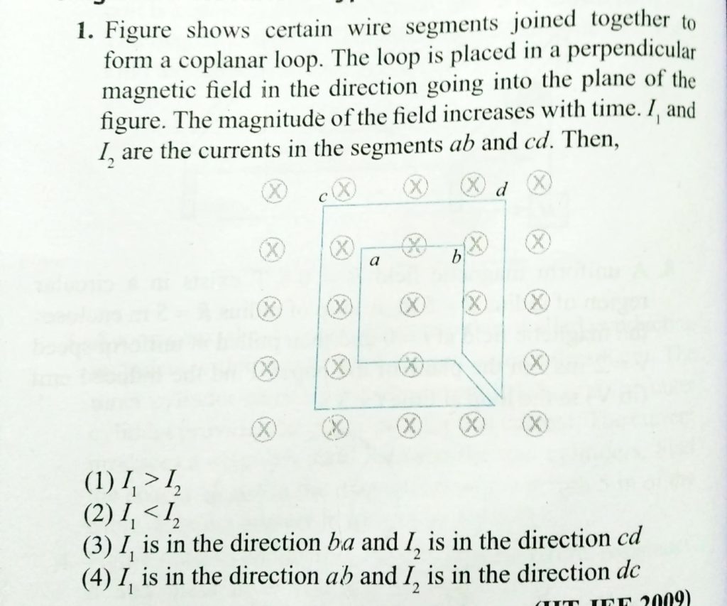 The figure shows certain wire segments joined together to form a coplanar loop. The loop is placed in a perpendicular magnetic field in the direction going into the plane of the figure. The magnitude of the field increases with time I1 and I2 are the currents in the segments ab and cd. Then,