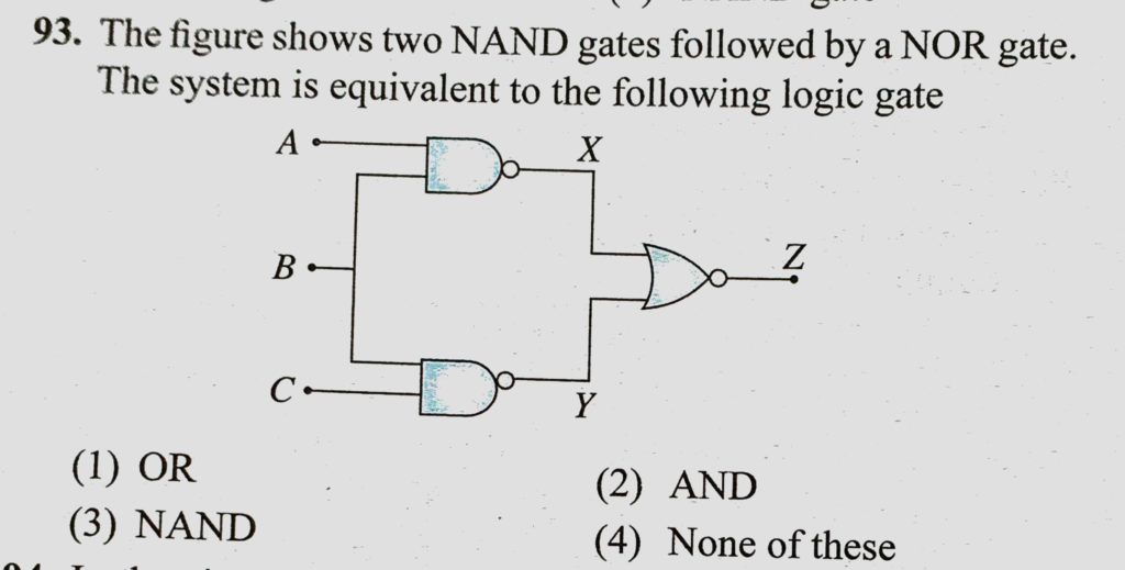 The figure shows two NAND gates followed by a NOR gate. The system is equivalent to the following logic gate The figure shows two NAND gates followed by a NOR gate. The system is equivalent to the following logic gate October 22, 2020 Category: Uncategorised (JEE Advanced Physics by BM Sharma + GMP Solutions) , Facebook Messenger WhatsApp Share this:TwitterFacebook Related