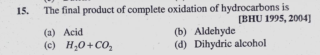 The final product of complete oxidation of hydrocarbons is (a) Acid (b) Aldehyde (c) H2O + CO2 The final product of complete oxidation of hydrocarbons is (a) Acid (b) Aldehyde (c) H2O + CO2 December 12, 2020 Category: Uncategorised (JEE Advanced Physics by BM Sharma + GMP Solutions) , Facebook Messenger WhatsApp Share this:TwitterFacebook Related