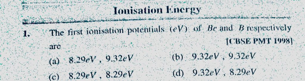 The first ionisation potentials (eV) of Be and B respectively are (a) 8.29 eV, 9.32 eV (b) 9.32 eV, 9.32 eV (c) 8.29 eV, 8.29 eV (d) 9.32 eV, 8.29 eV 8.29 eV 8.29 eV (d) 9.32 eV 9.32 eV (b) 9.32 eV 9.32 eV (c) 8.29 eV The first ionisation potentials (eV) of Be and B respectively are (a) 8.29 eV November 9, 2020 Category: Uncategorised (JEE Advanced Physics by BM Sharma + GMP Solutions) , Facebook Messenger WhatsApp Share this:TwitterFacebook Related