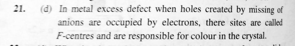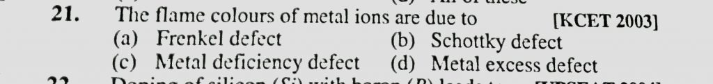 The flame colours of metal ions are due to (a) Frenkel defect (b) Schottky defect (c) Metal deficiency defect (d) metal excess defect The flame colours of metal ions are due to (a) Frenkel defect (b) Schottky defect (c) Metal deficiency defect (d) Metal excess defect February 9, 2021 Category: Uncategorised (JEE Advanced Physics by BM Sharma + GMP Solutions) , Facebook Messenger WhatsApp Share this:TwitterFacebook Related