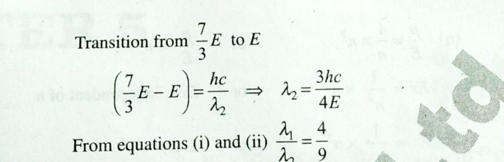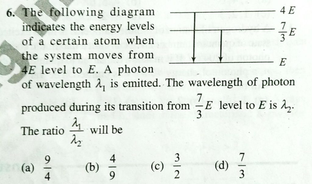 The following diagram indicates the energy levels of a certain atom when the system moves from 4E level to E. A photon of wavelength λ1 is emitted. The wavelength of photon produced during its transition from 7 / 3 E level to E is λ2. the ratio λ1 / λ2 will be