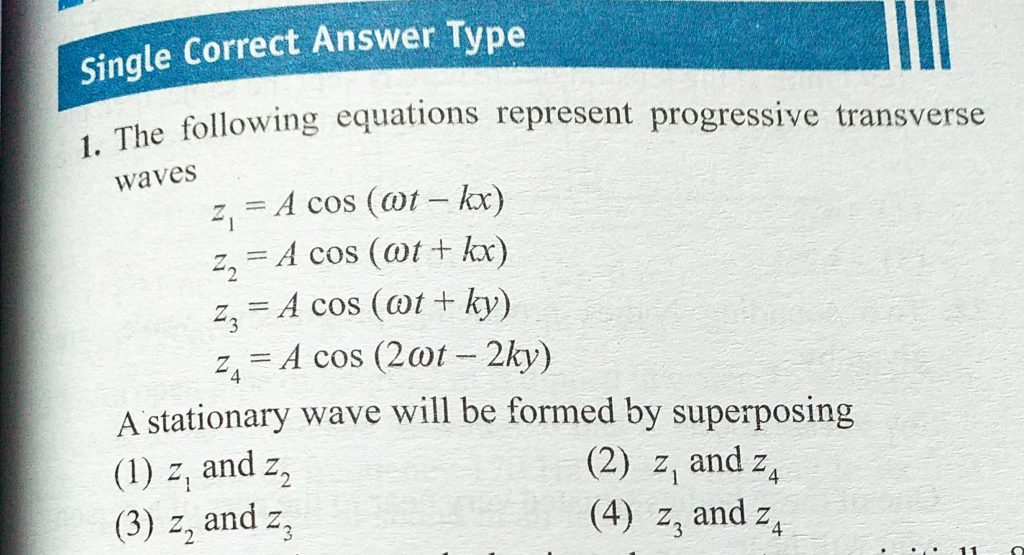 The following equations represent progressive transverse waves z1 = A cos (omega t – kx) Z2 = A cos (omega t + kx) z3 = A cos (omega t + ky) z4 = A cos (2 omega t – 2ky) The following equations represent progressive transverse waves z1 = A cos (omega t - kx) Z2 = A cos (omega t + kx) z3 = A cos (omega t + ky) z4 = A cos (2 omega t - 2ky) November 5, 2020 Category: Uncategorised (JEE Advanced Physics by BM Sharma + GMP Solutions) , Facebook Messenger WhatsApp Share this:TwitterFacebook Related