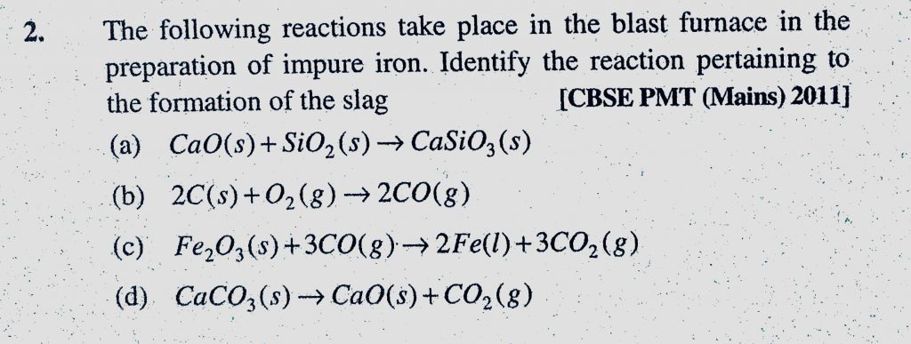 The following reactions take place in the blast furnace in the preparation of impure iron. Identify the reaction pertaining to the formation of the slag The following reactions take place in the blast furnace in the preparation of impure iron. Identify the reaction pertaining to the formation of the slag November 11, 2020 Category: Uncategorised (JEE Advanced Physics by BM Sharma + GMP Solutions) , Facebook Messenger WhatsApp Share this:TwitterFacebook Related