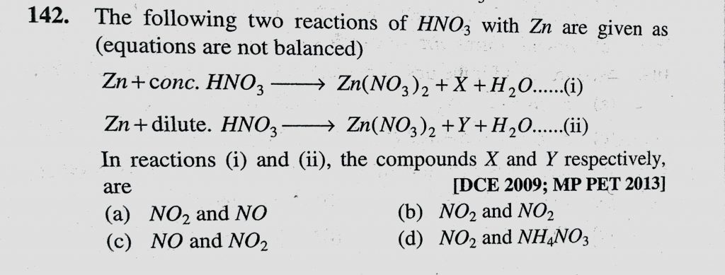 The following two reactions of HNO3 with Zn are given as (equations are not balanced) Zn + Conc. HNO3 to Zn(NO3)2 + X + H2O The following two reactions of HNO3 with Zn are given as (equations are not balanced) Zn + Conc. HNO3 to Zn(NO3)2 + X + H2O November 23, 2020 Category: Uncategorised (JEE Advanced Physics by BM Sharma + GMP Solutions) , Facebook Messenger WhatsApp Share this:TwitterFacebook Related