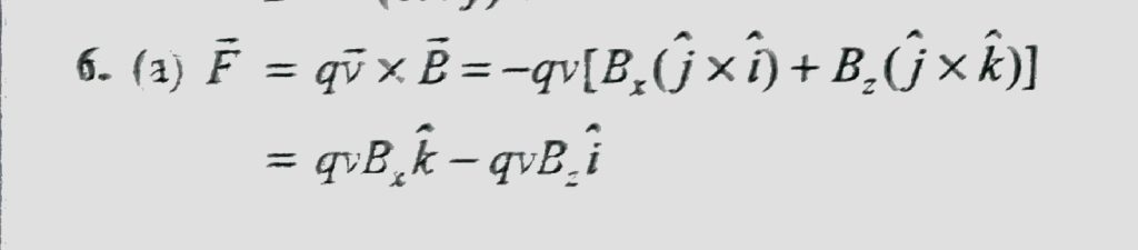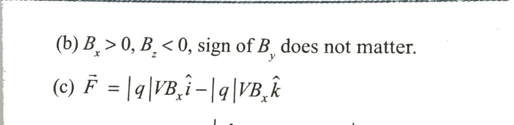 The force on a charged particle moving in a magnetic field can be computed as the vector sum of the force due to each separate component of the magnetic field. As an example, a particle with charge q is moving with speed v in the -y direction. It is moving in a uniform magnetic field B→=Bxiˆ+Byjˆ+Bzkˆ. a. What are the components of the force F→ exerted on the particle by the magnetic field? b. If q>0, what must the signs of the components of B→ be if the components of F→ are all non-negative? c. If q0, find the direction and magnitude of F in terms of |q|, v and Bx.