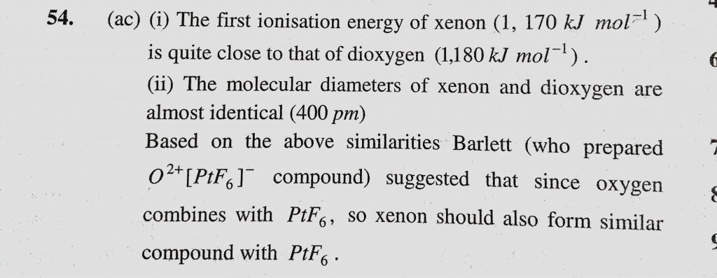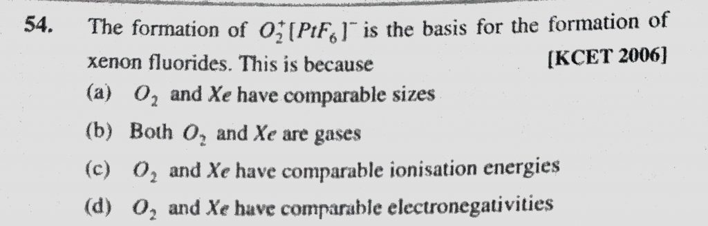 The formation of O2+(PtF6)- is the basis for the formation of xenon fluorides. This is because (a) O2 and Xe have comparable sizes The formation of O2+(PtF6)- is the basis for the formation of xenon fluorides. This is because (a) O2 and Xe have comparable sizes November 25, 2020 Category: Uncategorised (JEE Advanced Physics by BM Sharma + GMP Solutions) , Facebook Messenger WhatsApp Share this:TwitterFacebook Related