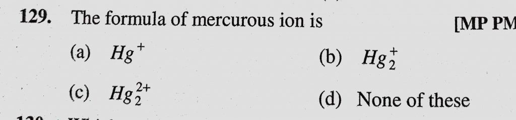 The formula of mercurous ion is (a) Hg+ (b) Hg2 + (c) Hg2 2+ (d) None of these The formula of mercurous ion is (a) Hg+ (b) Hg2 + (c) Hg2 2+ (d) None of these November 30, 2020 Category: Uncategorised (JEE Advanced Physics by BM Sharma + GMP Solutions) , Facebook Messenger WhatsApp Share this:TwitterFacebook Related
