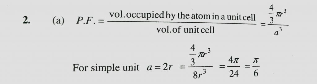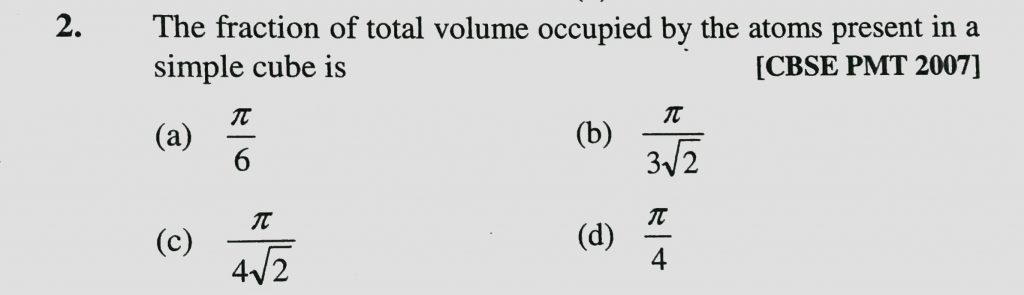 The fraction of total volume occupied by the atoms present in a simple cube is (a) pie/6 (b) pie / 3root2 (c) pie/4root 2 (d) pie/4 The fraction of total volume occupied by the atoms present in a simple cube is (a) pie/6 (b) pie / 3root2 (c) pie/4root 2 (d) pie/4 December 16, 2020 Category: Uncategorised (JEE Advanced Physics by BM Sharma + GMP Solutions) , Facebook Messenger WhatsApp Share this:TwitterFacebook Related