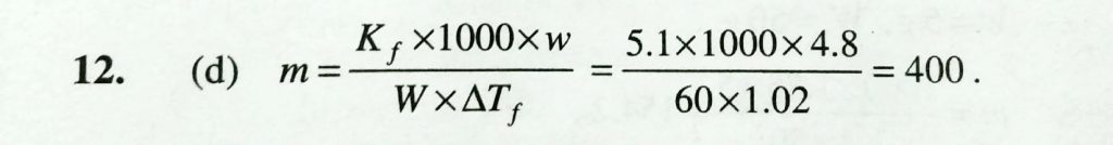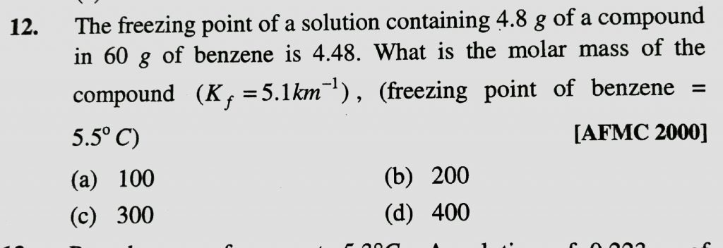 The freezing point of a solution containing 4.8 g of a compound in 60 g of benzene is 4.48 . what is the molar mass of the compound ( Kf = 5.1 km/s ) , ( freezing point of benzene = 5.5 degree C ) ( freezing point of benzene = 5.5 degree C ) The freezing point of a solution containing 4.8 g of a compound in 60 g of benzene is 4.48 . what is the molar mass of the compound ( Kf = 5.1 km/s ) December 14, 2020 Category: Uncategorised (JEE Advanced Physics by BM Sharma + GMP Solutions) , Facebook Messenger WhatsApp Share this:TwitterFacebook Related
