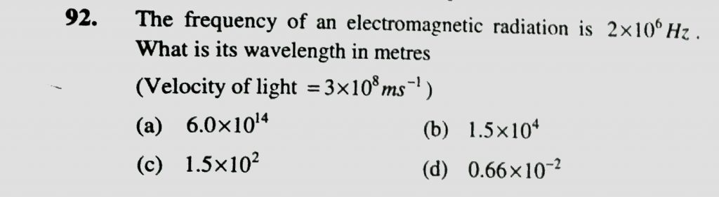 The frequency of an electromagnetic radition is 2 x 10^6 Hz. what is the wavelength in metres The frequency of an electromagnetic radition is 2 x 10^6 Hz. what is the wavelength in metres November 27, 2020 Category: Uncategorised (JEE Advanced Physics by BM Sharma + GMP Solutions) , Facebook Messenger WhatsApp Share this:TwitterFacebook Related
