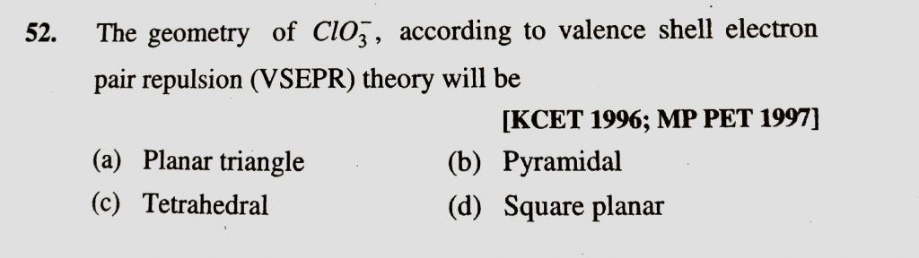 The geometry of CLO3^- , according to valence shell electron pair repulsion (VSEPR ) theory will be according to valence shell electron pair repulsion (VSEPR ) theory will be The geometry of CLO3^- December 7, 2020 Category: Uncategorised (JEE Advanced Physics by BM Sharma + GMP Solutions) , Facebook Messenger WhatsApp Share this:TwitterFacebook Related