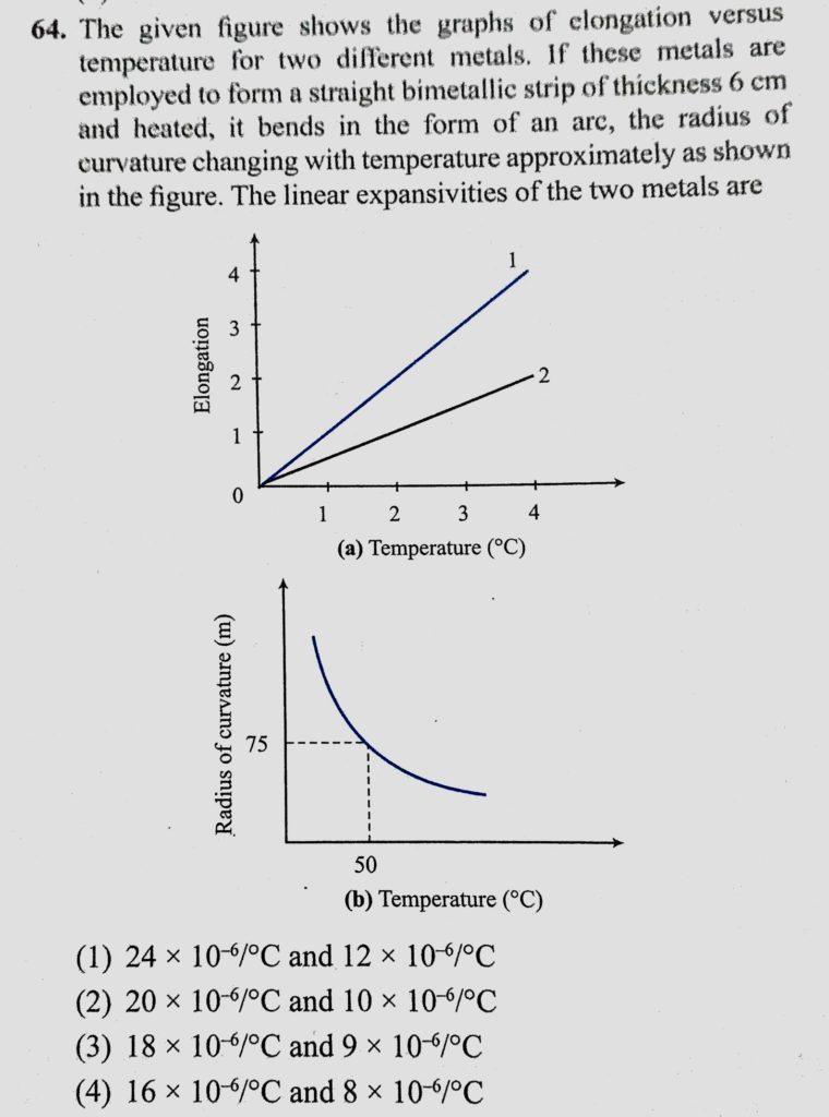 The given figure shows the graphs of elongation versus temperature for two different metals. If these metals are employed to form a straight bimetallic strip of thickness 6 cm and heated, The given figure shows the graphs of elongation versus temperature for two different metals. If these metals are employed to form a straight bimetallic strip of thickness 6 cm and heated October 24, 2020 Category: Uncategorised (JEE Advanced Physics by BM Sharma + GMP Solutions) , Facebook Messenger WhatsApp Share this:TwitterFacebook Related