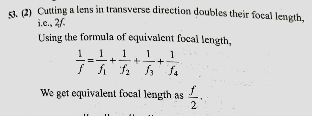 The given lens is broken into four parts rearranged as shown. If the initial focal length is f, then after rearrangement the equivalent focal length is The given lens is broken into four parts rearranged as shown. If the initial focal length is f then after rearrangement the equivalent focal length is October 8, 2020 Category: Uncategorised (JEE Advanced Physics by BM Sharma + GMP Solutions) , Facebook Messenger WhatsApp Share this:TwitterFacebook Related