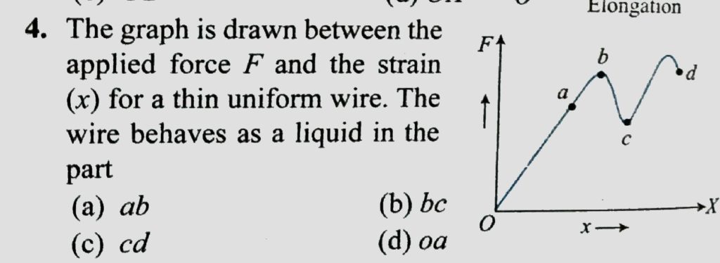 The graph is drawn between the applied force F and the strain (x) for a thin uniform wire. The wire behaves as a liquid in the part The graph is drawn between the applied force F and the strain (x) for a thin uniform wire. The wire behaves as a liquid in the part October 9, 2020 Category: Uncategorised (JEE Advanced Physics by BM Sharma + GMP Solutions) , Facebook Messenger WhatsApp Share this:TwitterFacebook Related