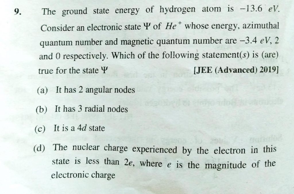 The ground state energy of hydrogen atom is -13.6 eV. Consider an electronic state of He^+ whose energy , azimuthal quantum number and are -3.4 eV , 2 annd 0 respectively. Which of the following statements is (are) true 2 annd 0 respectively. Which of the following statements is (are) true azimuthal quantum number and are -3.4 eV The ground state energy of hydrogen atom is -13.6 eV. Consider an electronic state of He^+ whose energy December 1, 2020 Category: Uncategorised (JEE Advanced Physics by BM Sharma + GMP Solutions) , Facebook Messenger WhatsApp Share this:TwitterFacebook Related