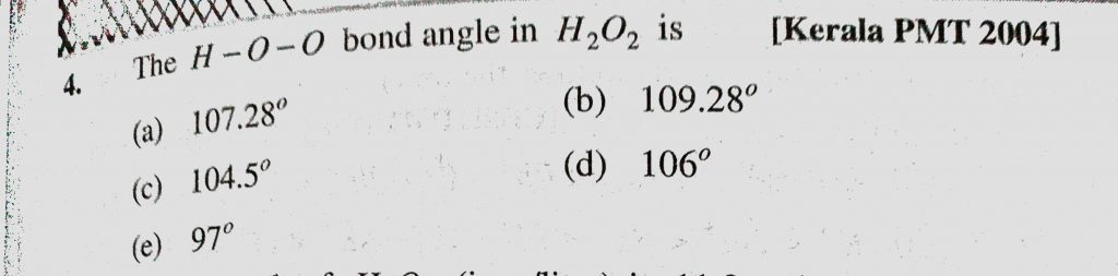 The H – O – O bond angle in H2O2 is (a) 107.28 (b) 109.28 (c) 104.5 (d) 106 (e) 97 The H - O - O bond angle in H2O2 is (a) 107.28 (b) 109.28 (c) 104.5 (d) 106 (e) 97 November 13, 2020 Category: Uncategorised (JEE Advanced Physics by BM Sharma + GMP Solutions) , Facebook Messenger WhatsApp Share this:TwitterFacebook Related