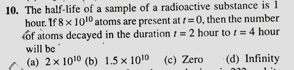 The half life of a sample of radioactive substamnce is 1 hour. If 8 x 10^10 atoms are present at t = 0, then the number of atoms decayed in the duration t = 2 hour to t = 4 hour will be The half life of a sample of radioactive substamnce is 1 hour. If 8 x 10^10 atoms are present at t = 0 then the number of atoms decayed in the duration t = 2 hour to t = 4 hour will be September 14, 2020 Category: Uncategorised (JEE Advanced Physics by BM Sharma + GMP Solutions) , Facebook Messenger WhatsApp Share this:TwitterFacebook Related