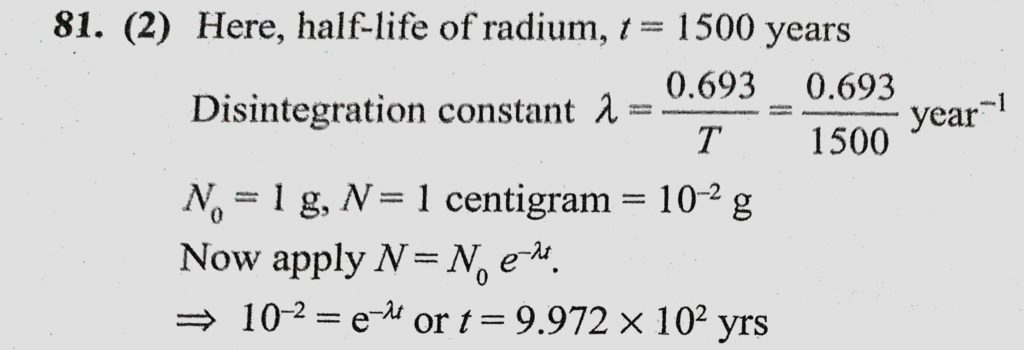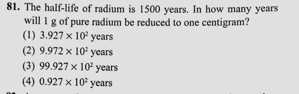 The half-life of radium is 1500 years. In how many years will 1 g pure radium be reduced to one centigram ? The half-life of radium is 1500 years. In how many years will 1 g pure radium be reduced to one centigram ? October 18, 2020 Category: Uncategorised (JEE Advanced Physics by BM Sharma + GMP Solutions) , Facebook Messenger WhatsApp Share this:TwitterFacebook Related