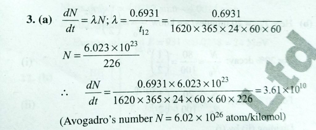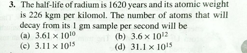 The half life of radium is 1620 years and its atomic weight is 226 kgm per kilomol. The number of atoms that will decay from its 1 gm sample per second will be The half life of radium is 1620 years and its atomic weight is 226 kgm per kilomol. The number of atoms that will decay from its 1 gm sample per second will be September 14, 2020 Category: Uncategorised (JEE Advanced Physics by BM Sharma + GMP Solutions) , Facebook Messenger WhatsApp Share this:TwitterFacebook Related