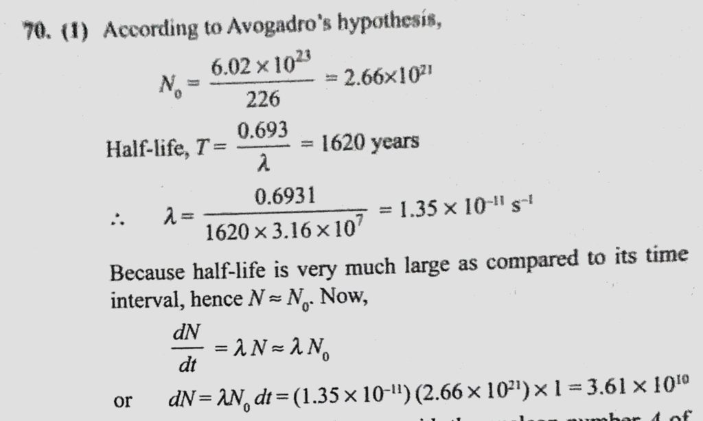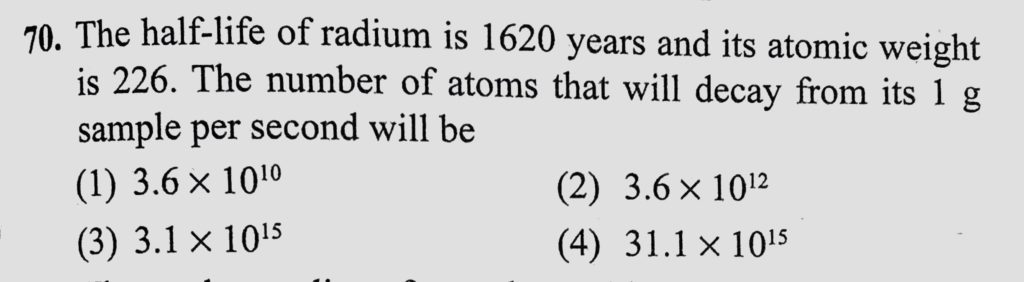 The half-life of radium is 1620 years and its atomic weight is 226. The number of atoms that will decay from its 1 g sample per second will be The half-life of radium is 1620 years and its atomic weight is 226. The number of atoms that will decay from its 1 g sample per second will be October 18, 2020 Category: Uncategorised (JEE Advanced Physics by BM Sharma + GMP Solutions) , Facebook Messenger WhatsApp Share this:TwitterFacebook Related