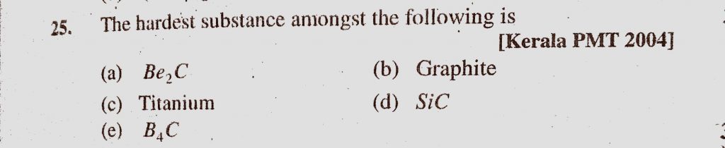 The hardest substance amongst the following is (a) Be2C (b) Graphite (c) Titanium (d) SiC (e) B4C The hardest substance amongst the following is (a) Be2C (b) Graphite (c) Titanium (d) SiC (e) B4C November 17, 2020 Category: Uncategorised (JEE Advanced Physics by BM Sharma + GMP Solutions) , Facebook Messenger WhatsApp Share this:TwitterFacebook Related