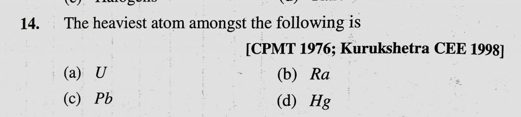 The heaviest atom amongst the following is (a) U (b) Ra (c) pb (d) Hg The heaviest atom amongst the following is (a) U (b) Ra (c) pb (d) Hg November 8, 2020 Category: Uncategorised (JEE Advanced Physics by BM Sharma + GMP Solutions) , Facebook Messenger WhatsApp Share this:TwitterFacebook Related