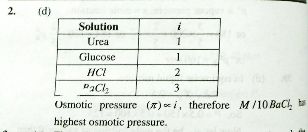 The highest osmotic pressure corresponds to the following solution (a) M /10 urea (b) M/10 glucose (c) M/10 HCL (d) M/10 BaCL2 The highest osmotic pressure corresponds to the following solution (a) M /10 urea (b) M/10 glucose (c) M/10 HCL (d) M/10 BaCL2 December 13, 2020 Category: Uncategorised (JEE Advanced Physics by BM Sharma + GMP Solutions) , Facebook Messenger WhatsApp Share this:TwitterFacebook Related