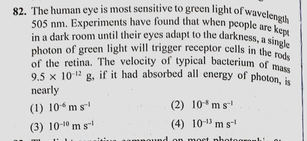 The human eye is most sensitive to green light of wavelength 505 nm. Experiments have found that when people are kept in a dark room until their eyes adapt to the darkness, a single photon a single photon The human eye is most sensitive to green light of wavelength 505 nm. Experiments have found that when people are kept in a dark room until their eyes adapt to the darkness October 14, 2020 Category: Uncategorised (JEE Advanced Physics by BM Sharma + GMP Solutions) , Facebook Messenger WhatsApp Share this:TwitterFacebook Related