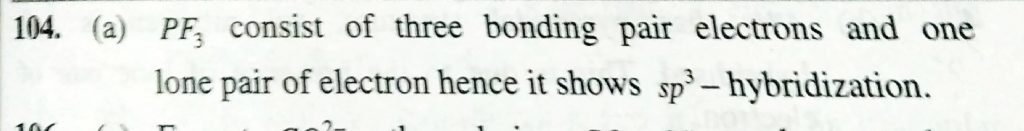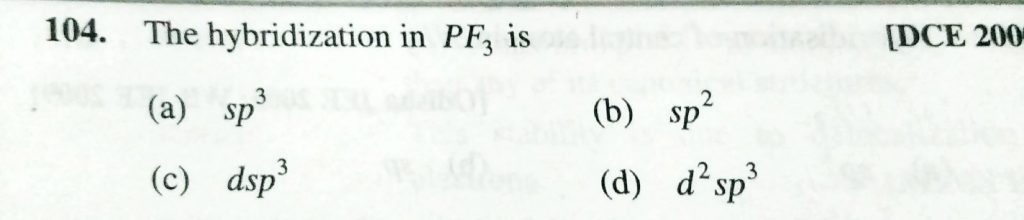The hybridization in PF3 is (a) sp^3 (b) sp^2 (c) dsp^3 (d) d^2sp^3 The hybridization in PF3 is (a) sp^3 (b) sp^2 (c) dsp^3 (d) d^2sp^3 December 6, 2020 Category: Uncategorised (JEE Advanced Physics by BM Sharma + GMP Solutions) , Facebook Messenger WhatsApp Share this:TwitterFacebook Related