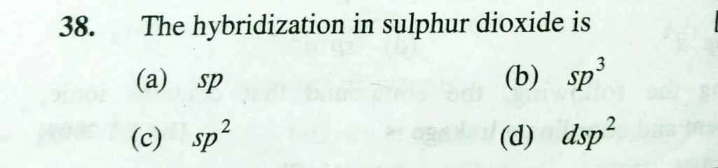 The hybridization in sulphur dioxide is (a) sp (b) sp^3 (c) sp^2 (d) dsp^2 The hybridization in sulphur dioxide is (a) sp (b) sp^3 (c) sp^2 (d) dsp^2 December 9, 2020 Category: Uncategorised (JEE Advanced Physics by BM Sharma + GMP Solutions) , Facebook Messenger WhatsApp Share this:TwitterFacebook Related